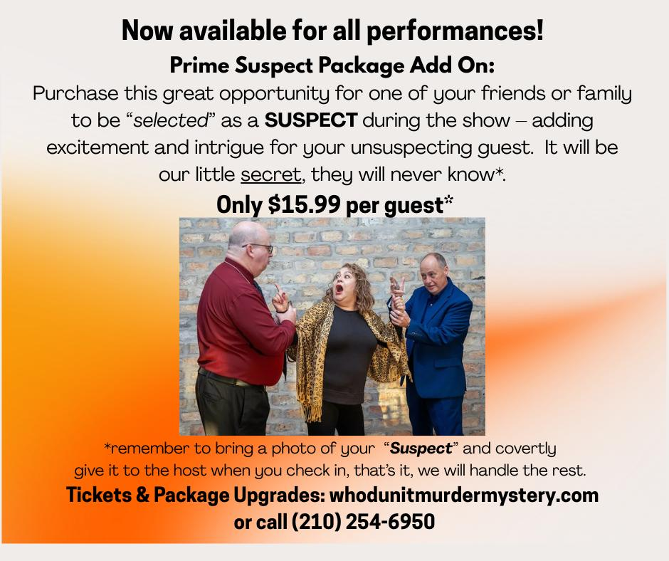 Prime Suspect Package: $15.99 each. Purchase this great add-on opportunity for one of your friends or family to be “selected” as a SUSPECT during the show – adding excitement and intrigue for your unsuspecting guest.